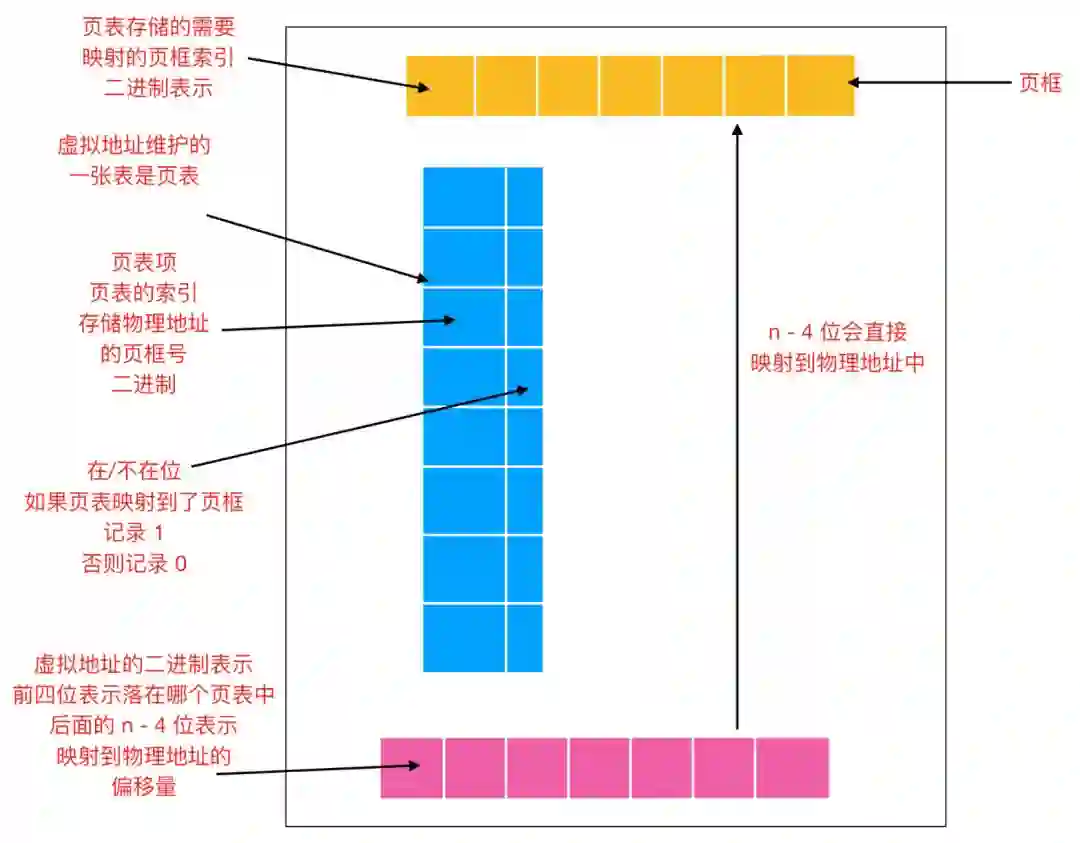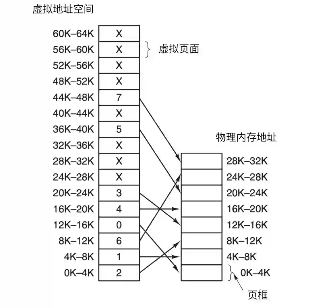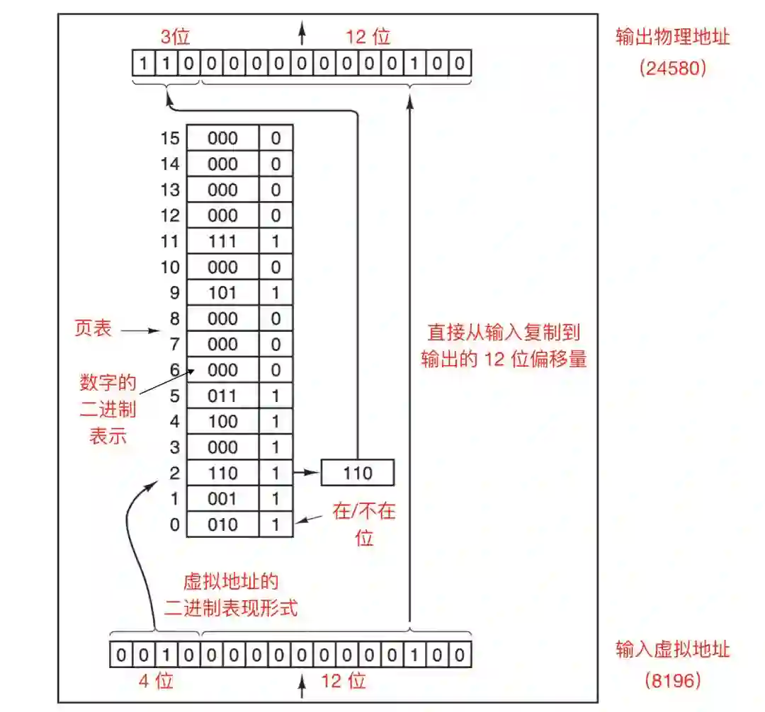 上图中有 8 个物理页框,于是只有 8 个虚拟页被映射到了物理内存中,在上图中用 X 号表示的其他页面没有被映射。在实际的硬件中,会使用一个 在/不在(Present/absent bit)位记录页面在内存中的实际存在情况。