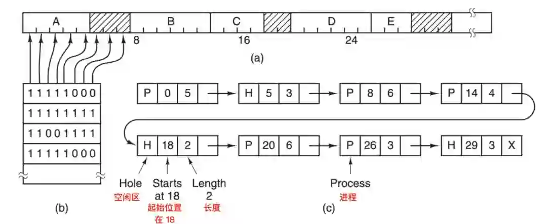 图 a 表示一段有 5 个进程和 3 个空闲区的内存,刻度为内存分配单元,阴影区表示空闲(在位图中用 0 表示);图 b 表示对应的位图;图 c 表示用链表表示同样的信息。