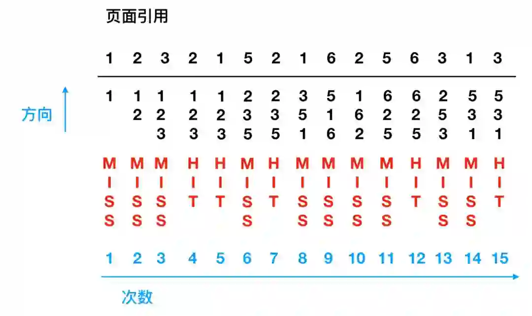 它们在两个时钟周期内都没有被访问过,在此之前的时钟周期内都引用了两个页面。根据 LRU 算法,如果需要置换的话,那么应该在这两个页面中选择一个。那么问题来了,我萌应该选择哪个?现在的问题是我们不知道时钟周期 1 到时钟周期 2 内它们中哪个页面是后被访问到的。因为在每个时钟周期内只记录了一位,所以无法区分在一个时钟周期内哪个页面最早被引用,哪个页面是最后被引用的。因此,我们能做的就是置换页面3,因为页面 3 在周期 0 - 1 内都没有被访问过,而页面 5 却被引用过。