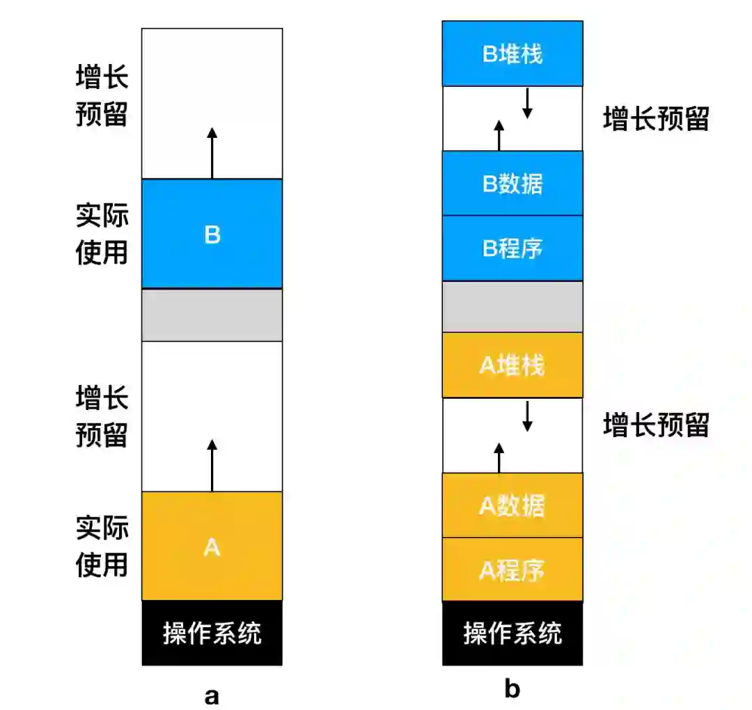 如果进程有两个可增长的段,例如,供变量动态分配和释放的作为堆(全局变量)使用的一个数据段(data segment),以及存放局部变量与返回地址的一个堆栈段(stack segment),就如图 b 所示。在图中可以看到所示进程的堆栈段在进程所占内存的顶端向下增长,紧接着在程序段后的数据段向上增长。当增长预留的内存区域不够了,处理方式就如上面的流程图(data segment 自动增长的三种处理方式)一样了。