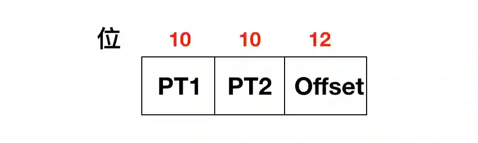 32 位的虚拟地址被划分为 10 位的 PT1 域,10 位的 PT2 域,还有 12 位的 Offset 域。因为偏移量是 12 位,所以页面大小是 4KB,公有 2^20 次方个页面。