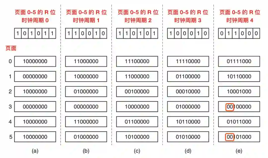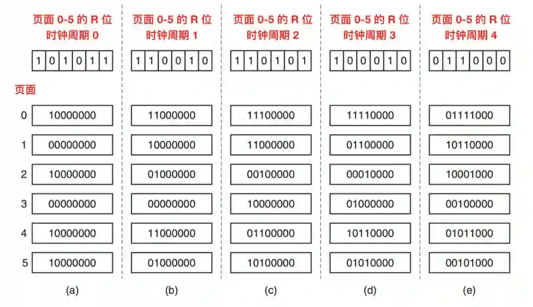 我们假设在第一个时钟周期内页面 0 - 5 的 R 位依次是 1,0,1,0,1,1,(也就是页面 0 是 1,页面 1 是 0,页面 2 是 1 这样类推)。也就是说,在 0 个时钟周期到 1 个时钟周期之间,0,2,4,5 都被引用了,从而把它们的 R 位设置为 1,剩下的设置为 0 。在相关的六个计数器被右移之后 R 位被添加到 左侧 ,就像上图中的 a。剩下的四列显示了接下来的四个时钟周期内的六个计数器变化。