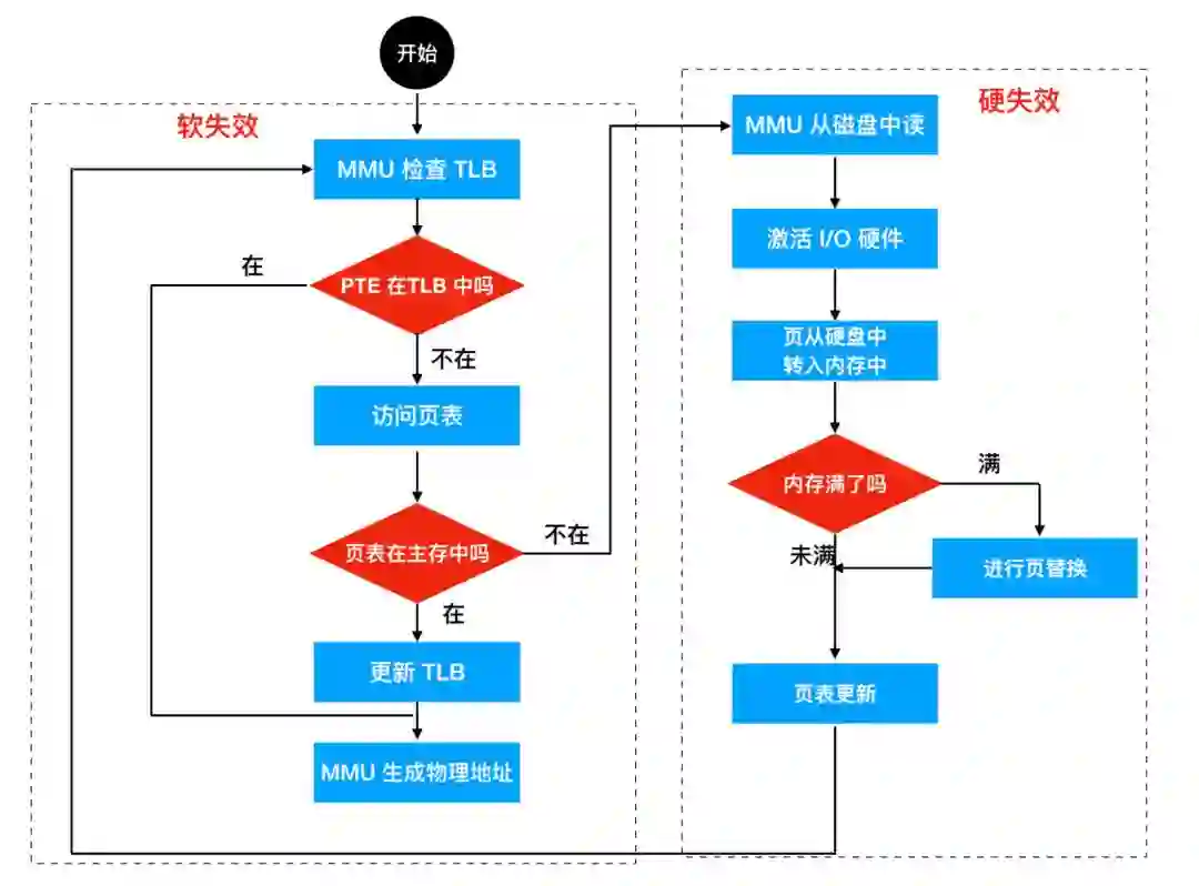 TLB 软件管理会有两种 TLB 失效问题,当一个页访问在内存中而不在 TLB 中时,将产生 软失效(soft miss),那么此时要做的就是把页表更新到 TLB 中(我们上面探讨的过程),而不会产生磁盘 I/O,处理仅仅需要一些机器指令在几纳秒的时间内完成。然而,当页本身不在内存中时,将会产生硬失效(hard miss),那么此时就需要从磁盘中进行页表提取,硬失效的处理时间通常是软失效的百万倍。在页表结构中查找映射的过程称为 页表遍历(page table walk)。