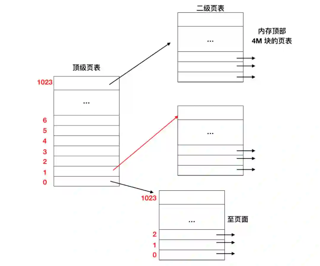 由索引顶级页表得到的表项中含有二级页表的地址或页框号。顶级页表的表项 0 指向程序正文的页表,表项 1 指向含有数据的页表,表项 1023 指向堆栈的页表,其他的项(用阴影表示)表示没有使用。现在把 PT2 域作为访问选定的二级页表的索引,以便找到虚拟页面的对应页框号。
