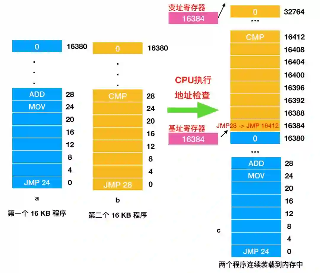 每当进程引用内存以获取指令或读取、写入数据时,CPU 都会自动将基址值添加到进程生成的地址中,然后再将其发送到内存总线上。同时,它检查程序提供的地址是否大于或等于变址寄存器 中的值。如果程序提供的地址要超过变址寄存器的范围,那么会产生错误并中止访问。这样,对上图 c 中执行 JMP 28 这条指令后,硬件会把它解释为 JMP 16412,所以程序能够跳到 CMP 指令,过程如下: