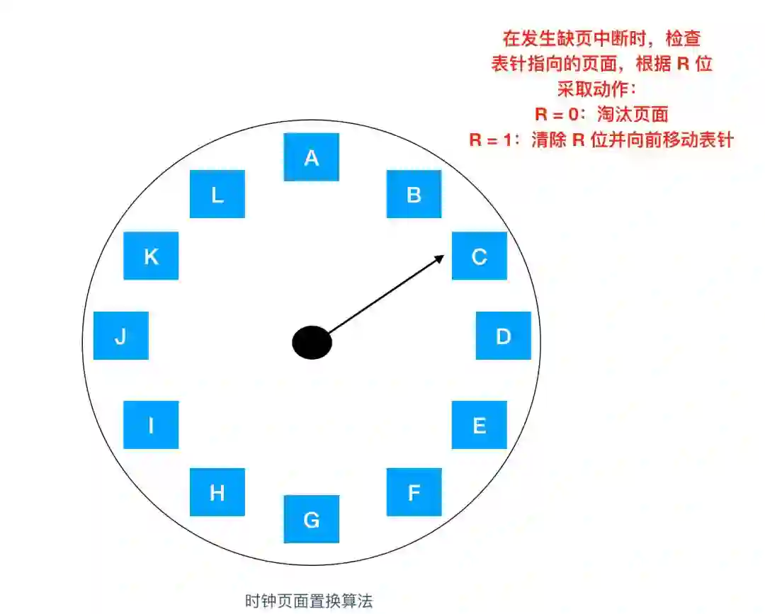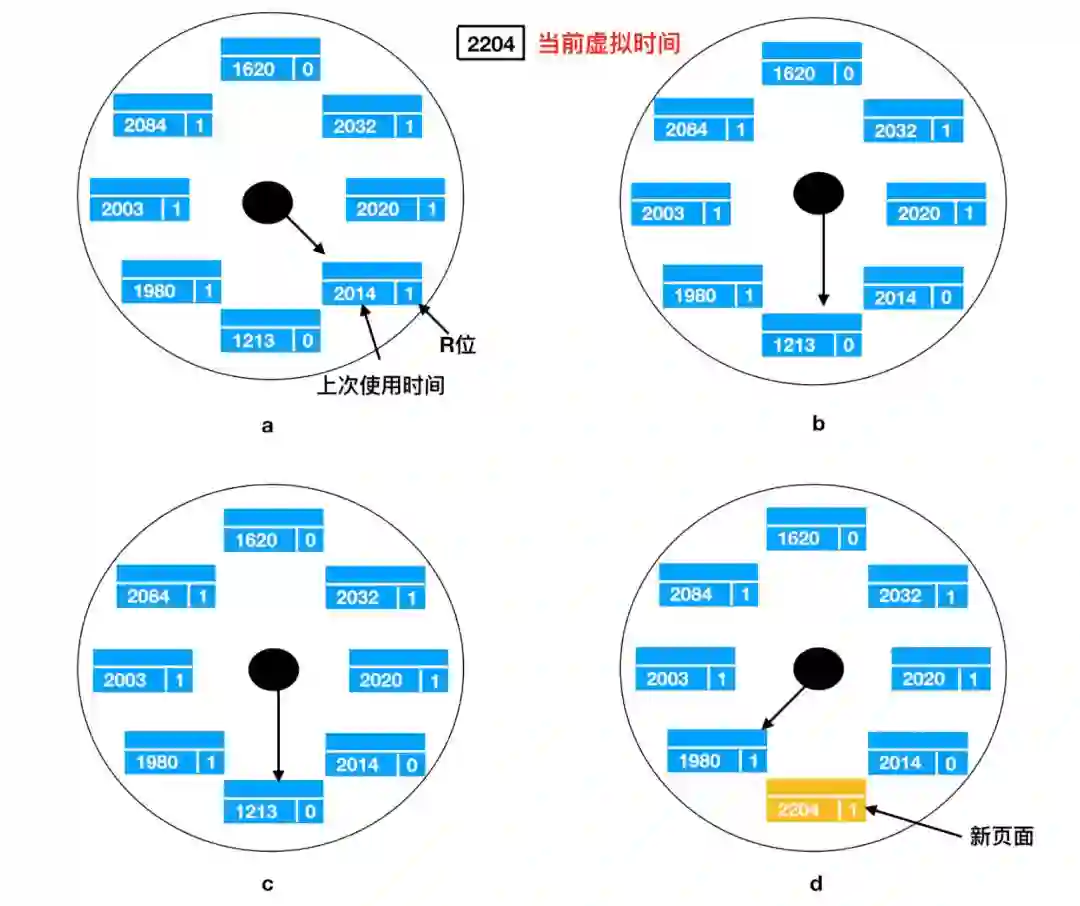 当缺页错误出现时,算法首先检查表针指向的页面,如果它的 R 位是 0 就淘汰该页面,并把新的页面插入到这个位置,然后把表针向前移动一位;如果 R 位是 1 就清除 R 位并把表针前移一个位置。重复这个过程直到找到了一个 R 位为 0 的页面位置。了解这个算法的工作方式,就明白为什么它被称为 时钟(clokc)算法了。
