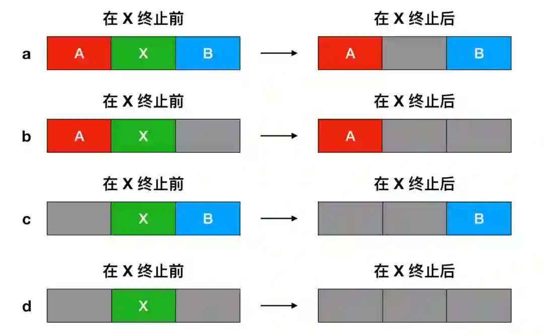 在这个例子中,段链表(segment list)是按照地址排序的。这种方式的优点是,当进程终止或被交换时,更新列表很简单。一个终止进程通常有两个邻居(除了内存的顶部和底部外)。相邻的可能是进程也可能是空闲区,它们有四种组合方式。