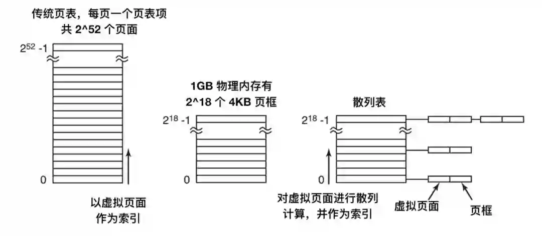解决这一问题的方式时使用 TLB。当发生 TLB 失效时,需要用软件搜索整个倒排页表。一个可行的方式是建立一个散列表,用虚拟地址来散列。当前所有内存中的具有相同散列值的虚拟页面被链接在一起。如下图所示: