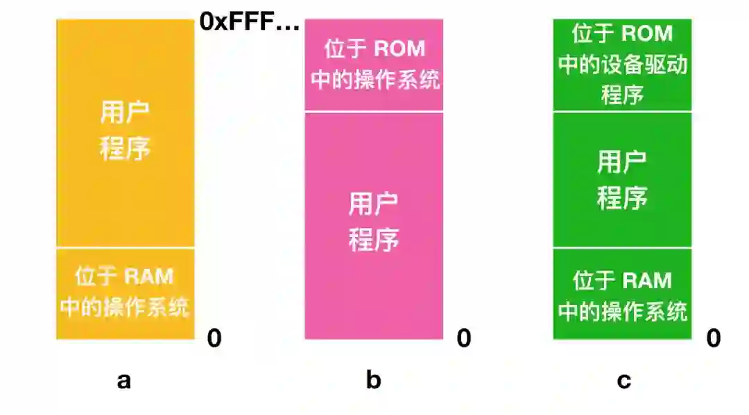 在上图 a 中,操作系统位于 RAM(Random Access Memory) 的底部,或像是图 b 一样位于 ROM(Read-Only Memory) 顶部;而在图 c 中,设备驱动程序位于顶端的 ROM 中,而操作系统位于底部的 RAM 中。图 a 的模型以前用在大型机和小型机上,但现在已经很少使用了;图 b 中的模型一般用于掌上电脑或者是嵌入式系统中。第三种模型就应用在早期个人计算机中了。ROM 系统中的一部分成为 BIOS (Basic Input Output System)。模型 a 和 c 的缺点是用户程序中的错误可能会破坏操作系统,可能会导致灾难性的后果。