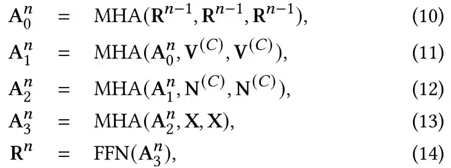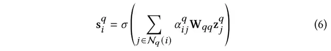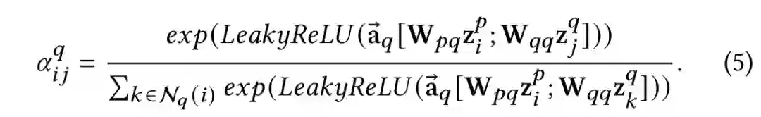 由于不同节点的模态组合不同,上步编码之后得到的图仍是异质的。为实现异质图上的多模态信息融合,作者使用双层图注意力机制。首先聚合同种模式下邻居的信息,接着聚合不同模式信息。