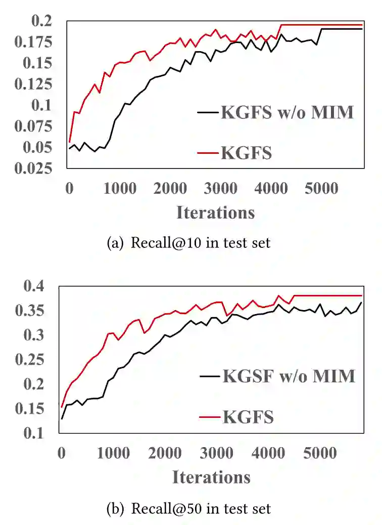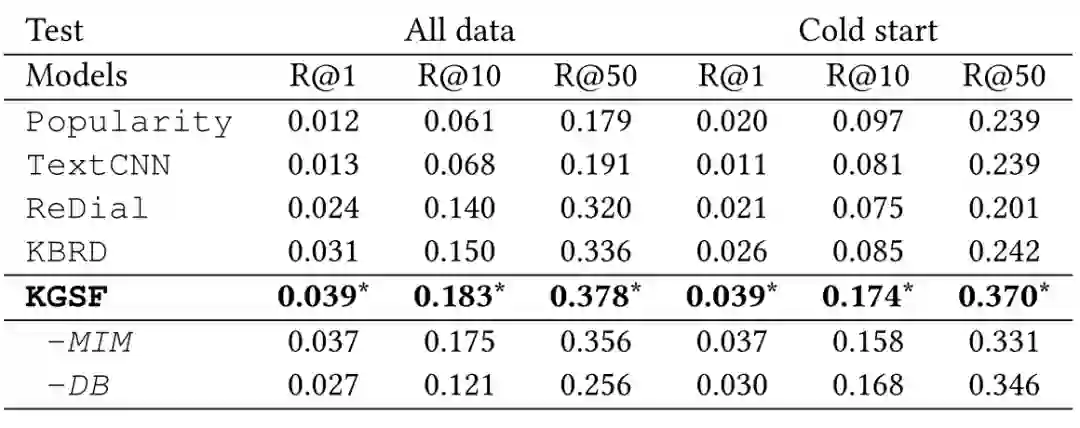 可以看到,不论是在常规推荐场景下还是冷启动(上下文未提及任何商品或属性)场景下,KGSF都能取得最优表现。