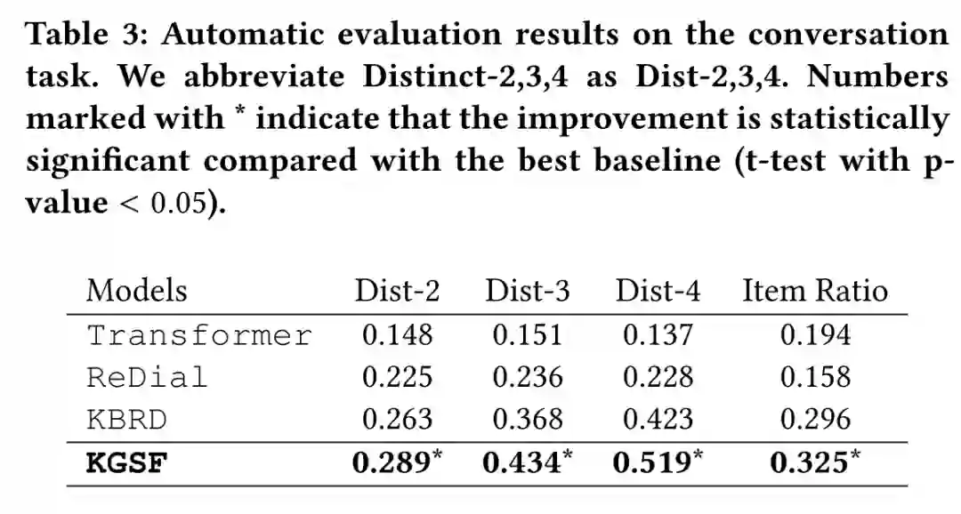 本文在CRS数据集ReDial上分别进行推荐任务以及对话生成任务实验,并对比了KGSF与其他baseline的表现。