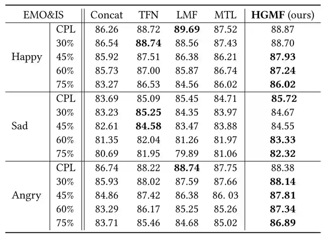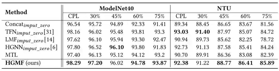 实验包含3D物体识别以及情感识别两个任务,前者使用双模态数据集ModelNet40以及NTU进行,后者选择三模态数据集IEMONAP进行。为了模拟实际应用中可能出现的模态缺失情况,作者设置了多模态不完整比例