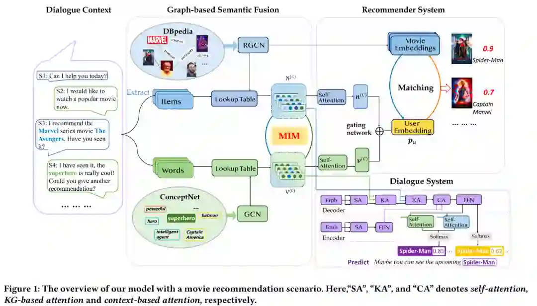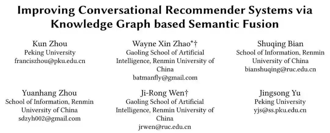 第二篇工作为《Improving Conversational Recommender Systems via Knowledge Graph based Semantic Fusion》,该工作通过引入两个外部知识图谱丰富会话的语义信息,并通过互信息最大化弥补知识图谱间的语义鸿沟以提升会话推荐系统的表现。