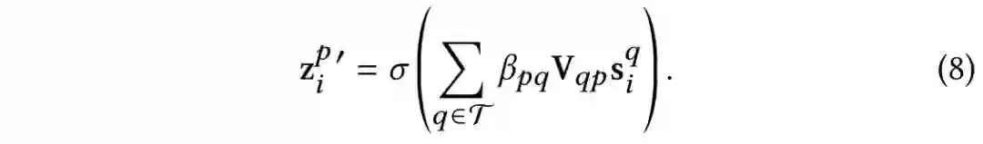 在聚合完模式内部信息之后,下一步是学习不同模式之间的关系,使得有不同模态缺失情况的数据点可以彼此学习,弥补缺失信息。聚合一个数据点的不同模式表示采用类似的注意力机制: