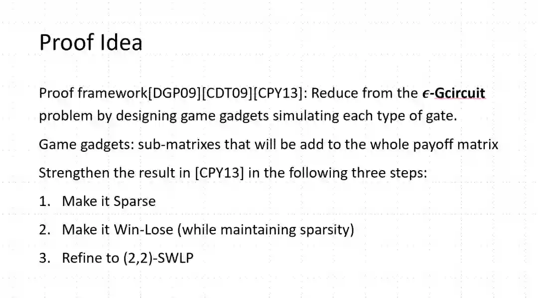 最后,一个重要的尚未解决的问题是 constant sparse win-lose bimatrix game 的纳什均衡解计算复杂度。这一问题目前的最优结果由 Zhengyang Liu 与 Ying Sheng 在2018年得到,他们证明了 logarithmic sparse win-lose bimatrix game 的纳什均衡解是 PPAD-Complete 的。然而,得到更强的常数稀疏可能需要新的证明技巧。