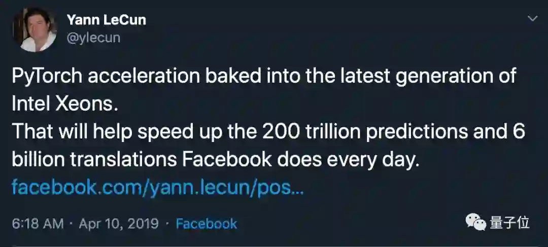 Facebook首席科学家、2019年图灵奖得主LeCun也发了一条推特,表示PyTorch获得了oneAPI的优化。