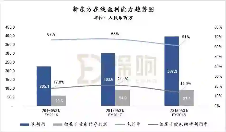 但即便在谨慎投入新业务的情况下,在线教育本身在抢市场阶段的推广开支,也还是让在线业务的利润表现不那么好看。相较于已经靠口碑传播多年,也早就建立起了成熟代理体系的线下业务,高昂的市场营销推广费用对在线教育的盈利能力是个拖累。
