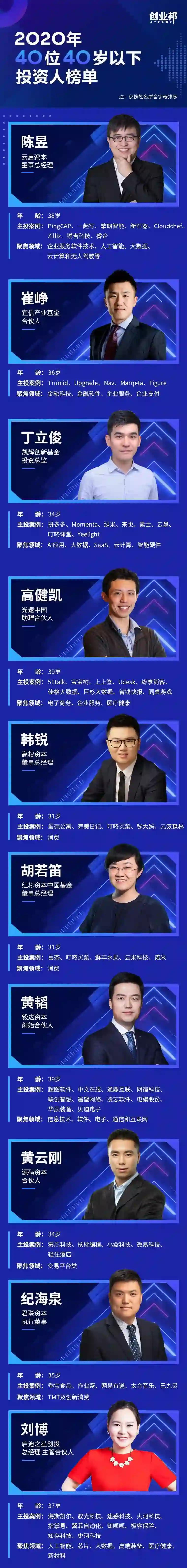 “2020 年 40 位 40 岁以下投资人”榜单从投资经验、投资表现、退出表现及业内影响四大维度综合考量,甄选出 40 位年度表现卓越的新生代投资人。