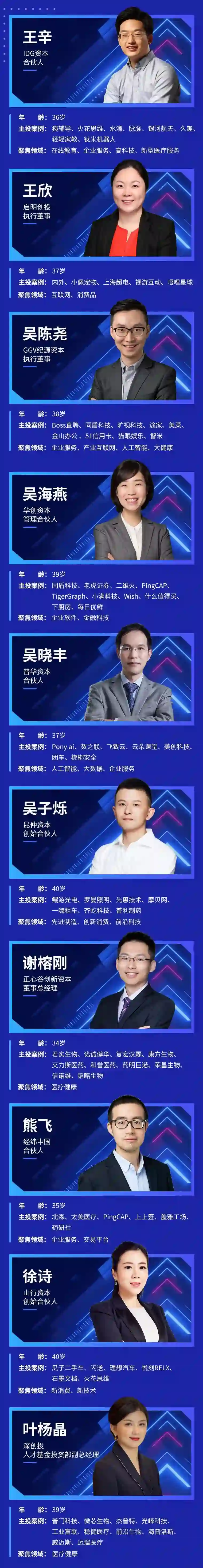 今年 40 位上榜投资人平均年龄是 36.7 岁,平均从业时间为 8.4 年,而去年,这个数据分别是 37 岁和 9.3年。本次上榜的投资人年龄不超过 35 岁的 85 后共计有 13 位,如红杉资本中国基金董事总经理胡若笛、腾讯投资执行董事张薇、高榕资本董事总经理韩锐、BAI资本董事总经理赵鹏岚等,此外,火山石资本的董事总经理刘凯,是首位上榜的 90 后,也是本次上榜者中年龄最小的投资人。