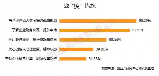 调研数据显示,90.29%的参评投资人都在积极和被投企业进行战略规划研讨,对风险进行梳理把控。其中,现金流的重要性再度被强调——82.52%的参评投资人会尽早了解被投企业的财务状况,未雨绸缪,对症下药;55.34%的参评投资人帮助企业对接银行等机构,以便获得短期低息贷款;部分投资人会关心创始团队的的身心健康、提供抗疫情物资等。