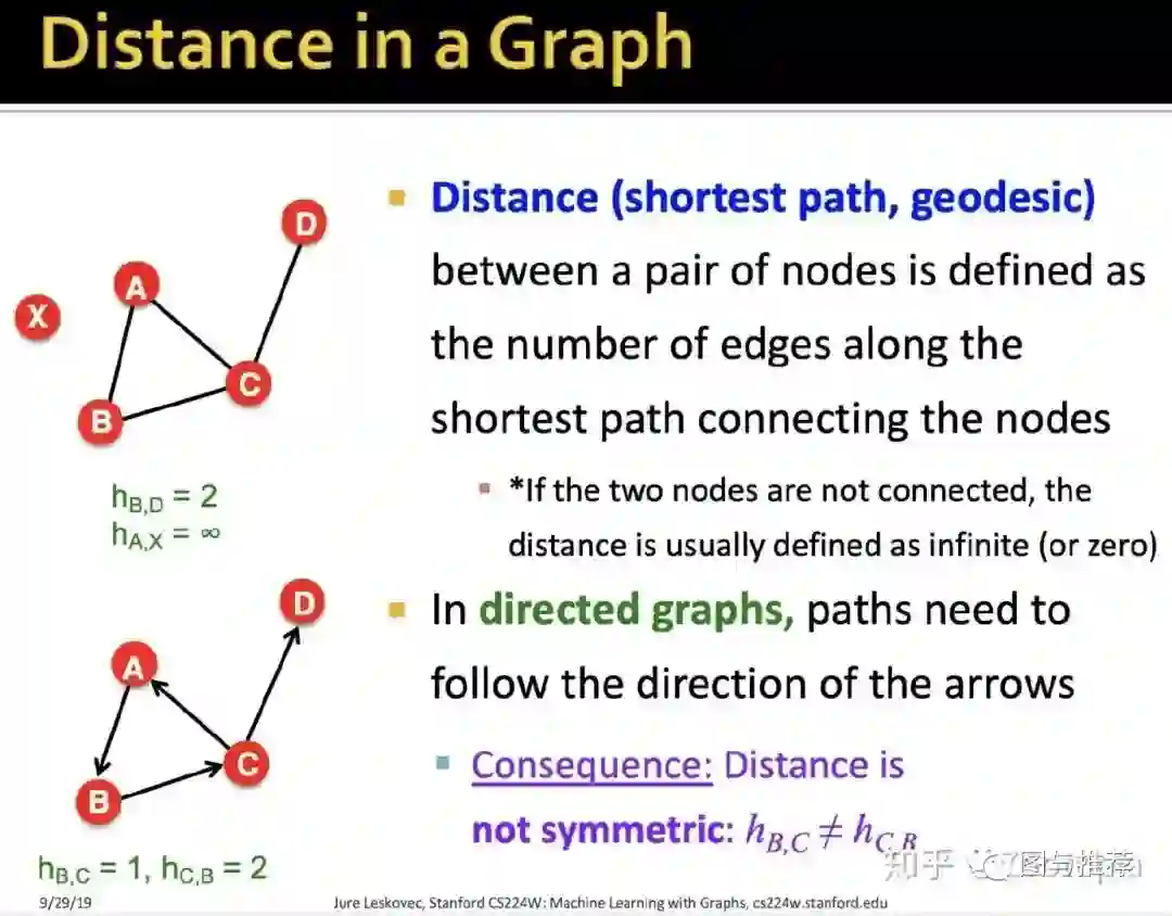 所以图中的B到C的距离是1,而节点C到节点B的距离则是2(C到A到B)