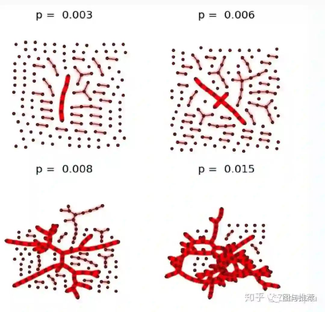 那么当聚合系数从0变化到1的过程中发生了什么变化?【当平均度=1的时候,因为k=p(n-1),此时聚合系数c=p=1/(n-1),出现了一个大连接元,以此类推】