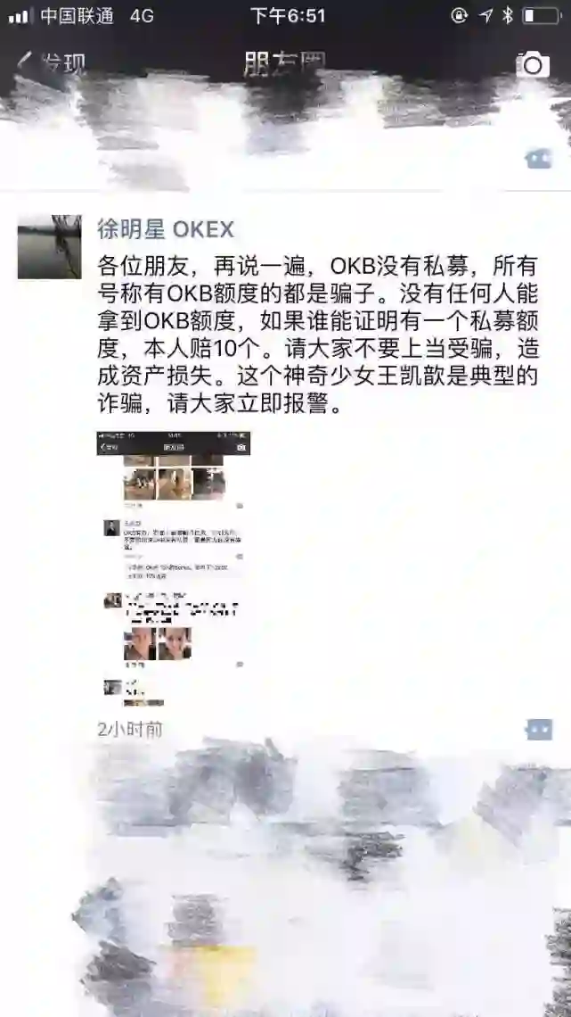 2月16日,国内着名虚拟货币交易平台OKCOIN(OKEX)创始人徐明星透过微信朋友圈宣布,平台旗下全球通用积分OKB并未进行私募,没有任何人能拿到OKB额度。此前,原神奇百货CEO王凯歆在朋友圈公开称“OKB有货”。对此,徐明星直指王凯歆是“诈骗”。