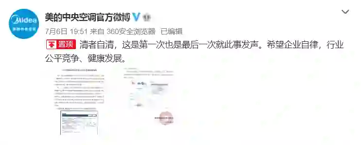 7月6日讯,美的官方微博发表声明表示:格力所提及在中国移动招标项目中的发票信息及技术参数存疑,均不属实,在招投标过程中早已向中国移动提供相关证据进行澄清说明,并被中国移动认可接受,整个招投标过程合法合规。美的表示:“清者自清,这是第一次也是最后一次就此事发声。希望企业自律,行业公平竞争、健康发展。”