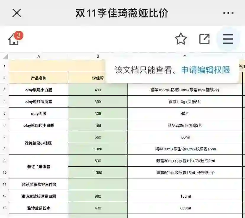 而各大主播发出直播预告后,争分夺秒地梳理产品功能、功效等,给用户进行清晰的价格对比和分类。丽芳留了个心眼,让运营在某热门的双十一价格文档里,加上自己直播间的品类和信息,趁乱在微博、小红书分发了出去。