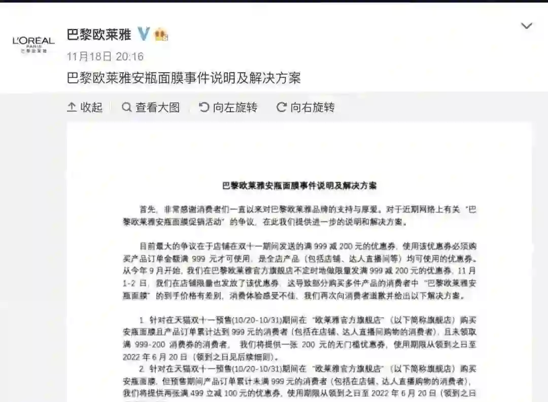 眼下,欧莱雅以优惠券赔偿暂时平了消费者的怒火,但丽芳觉得情况仍不乐观。买家可以用投诉、举报等组织严密的行为,来为自己争取正当权益。那么,行业也应该更新玩法,以求适应新的消费习惯。