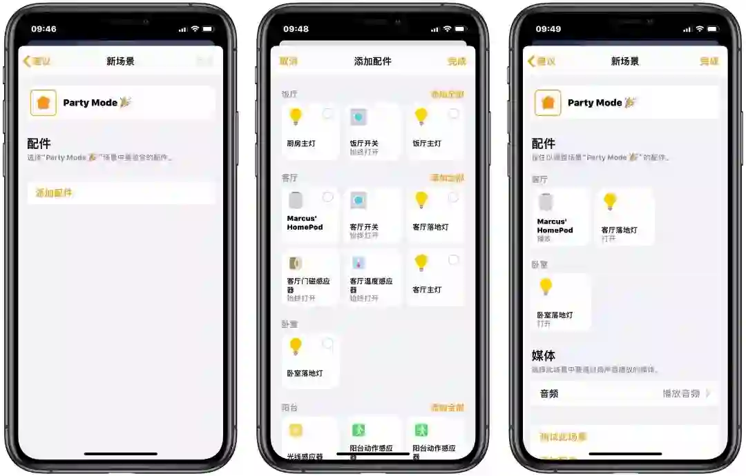 按照这个思路,你还可以设置「起床」的场景:激活之后自动打开窗帘,同时 HomePod 或者支持 AirPlay 的扬声器响起自己心仪的歌单,前一天晚上提前放好的吐司也在接入了智能插座的面包机上烤好了。