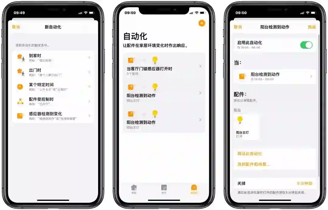 「配件受控制」和「感应器检测到变化」是我用得比较多的功能。当配件开启、关闭或检测到异常时,可以让其他配件和场景自动回应和执行操作。得益于智能门窗磁传感器以及智能感应器的感应功能,我设置了三个配件自动化条件,分别是「当客厅门磁感应器」打开时(也就是开门时),客厅的落地灯、卧室落地灯、玄关主灯自动开启,以及「阳台检测到动作时」(也就是有人进入阳台区域时),自动打开阳台主灯。