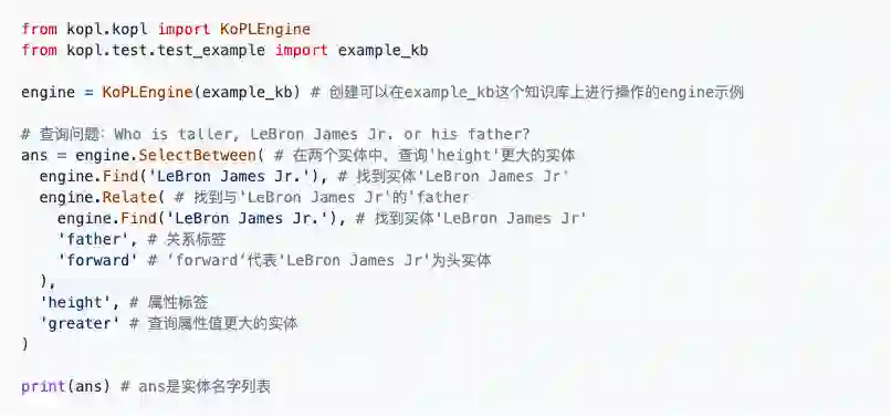 接下来,我们在程序中加载知识库,创建可以在这个知识库上执行的引擎,调用KoPL的基本函数,就可以实现面向知识的推理问答编程。图9是一个具体的例子,实现对“布朗尼·詹姆斯和他的父亲谁更高?”这个复杂问题的推理问答,KoPL程序给出了正确的答案: 勒布朗·詹姆斯!