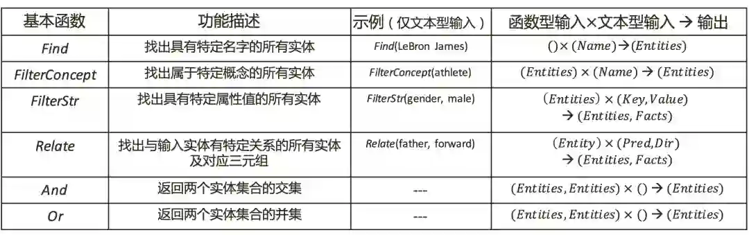 KoPL设计了14个基本函数,以支持对上述7种知识元素的操作。如Find函数找出具有特定名字的所有实体;FilterConcept函数找出属于特定概念的实体;Relate函数找出与输入实体有特定关系的所有实体。另外,KoPL还支持And和Or函数,通过两个实体集合的交和并来实现逻辑推理。图4展示了部分知识操作函数的功能描述、示例和输入输出。每个函数有两部分输入:一部分是函数输入(functional input),来自于其他函数的输出;另一部分是文本输入(textual input),来自于问题所指定的条件。