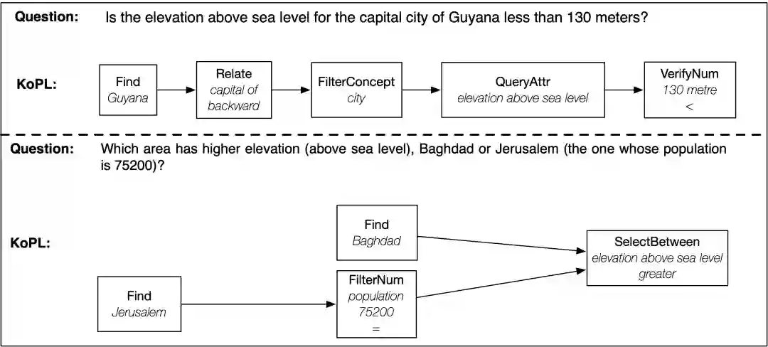 KoPL将复杂问题分解成多个推理步骤,每个步骤选择一个基本函数,对某种类型的知识进行操作,每个基本函数的输出都会写到内存里,作为后续函数的输入。KoPL的推理过程很容易被人类所理解,具有良好的可解释性。图6展示了两个自然语言问题及其对应的KoPL程序。
