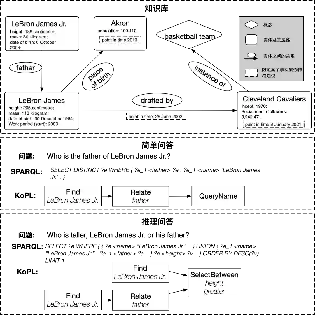 如图1所示,在早期的研究中,研究者主要关注单个关系型知识,即问题中仅涉及单个三元组,如“布朗尼·詹姆斯的父亲是谁”,只需要在知识资源中进行检索和匹配,就可以得到答案。这一类问答被称为简单问答。然而在很多情况下,问题不能通过检索和匹配直接得到答案,而是需要处理多跳关系、集合操作、属性比较等情况。例如问题“布朗尼·詹姆斯和他的父亲谁更高”,需要找到布朗尼·詹姆斯的父亲,并比较两个人的身高属性。这类针对复杂问题的问答任务称为推理问答。处理这些复杂问题要求计算机实现知识的表示和推理,并且能够处理Wikidata等结构化知识和Wikipedia等百科资源。