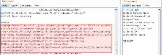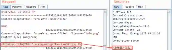 写入脚本代码。接下来,我把上传报文中的图片数据替换为一行无害的 JSP 代码: