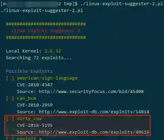一切就绪,正式进入提权操作。提权的手法很多,比如,利用内核栈溢出提权、搜寻配置文件中的明文密码、环境变量劫持高权限程序、不安全的服务、借助权能(POSIX capabilities)提权、sudo 误配、SUID 滥用等等。我喜欢快刀斩乱麻,将 linux-exploit-suggester-2 上传至目标后运行: