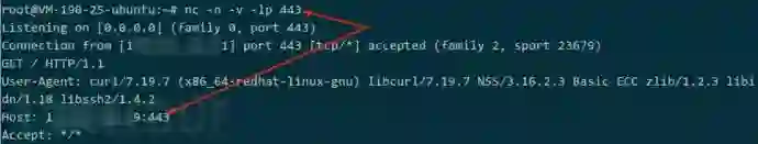 等待片刻,VPS 的并无 HTTP 记录,所以,怀疑采用白名单。经验来看,端口白名单通常只允许向外访问 HTTP 服务的默认 80、HTTPS 服务的默认 443,于是,VPS 监听 443 端口,目标上访问 443,这时 VPS 上获得 443 端口的访问记录: