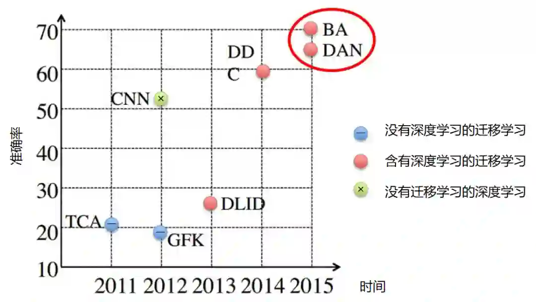 上图为深度迁移学习方法与非深度迁移学习方法的结果对比,展示了近几年的一些代表性方法在相同数据集上的表现。从图中的结果可以看出,与传统的非深度迁移学习方法(TCA、GFK等)相比,深度迁移学习方法(BA、DDC、DAN)在精度上具有显著的优势。