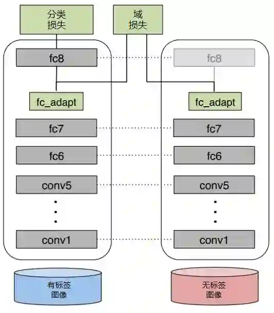 该网络由 AlexNet 修改而来,前面几层无变化,区别是在 fc7 层后面加入了一个域分类器,在该层实现域自适应,在 fc8 层后计算网络的损失函数和软标签损失函数。