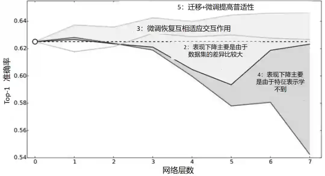 也就是说,在第4层、第5层,主要是由于 A 和 B 两个数据集的差异比较大,精度才会下降的;到了第 6 层、第 7 层,由于网络几乎不再迭代,学习能力太差,此时特征学不到,所以精度下降得更厉害。
