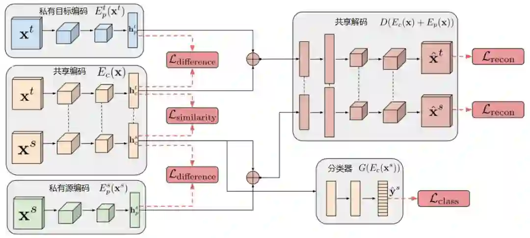 来自 Google Brain 的 Bousmalis 等人提出 DSN(Domain Separation Networks)方法对 DANN 进行了扩展 [Bousmalis et al.,2016]。DSN 方法认为,源域和目标域都由两部分构成:公共部分和私有部分。公共部分可以学习公共的特征,私有部分用来保持各个领域独立的特性。DSN 方法进一步对损失函数进行了定义。