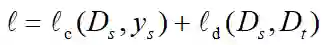 与深度网络自适应迁移方法类似,深度对抗网络的损失函数也由两部分构成:网络训练损失函数 和领域判别损失函数 ,如下所示。