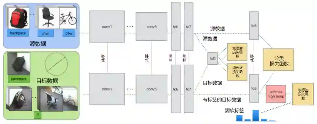 Tzeng 针对目标任务的部分类别有少量标签,剩下的类别无标签的情况,提出名为域迁移和任务迁移的联合 CNN 体系结构(Joint CNN Architecture For Domain and Task Transfer)。其最大的创新之处在于,提出现有的方法都忽略了类别之间的联系,并提出在现有损失函数的基础上还要再加一个软标签损失(Soft Label Loss)函数。
