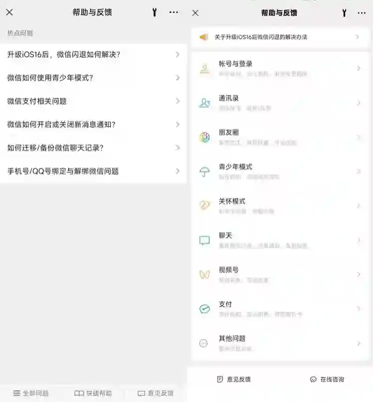 此次更新微信还新增了人工客服功能,据了解,测试版中“设置”页面中的“帮助与反馈”页面 UI 进行了重构,对应的问题前面新增了图标,整体而言更明了,此外还新增了“在线咨询”入口,可以直达“腾讯客服”的公众号。不过目前该公众号中似乎还没有接入人工客服,仍以自动回复机器人为主。