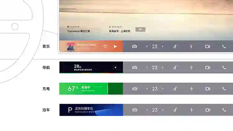 今天上午,魅族公布了 FlymeAuto 车机系统的相关细节,FlymeAuto 基于 Alive Design 理念打造,Flyme 系统上经典的 Smart Bar、小窗模式、节日桌面三大手机交互功能,均在 FlymeAuto 上得以延续。