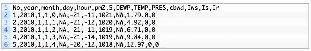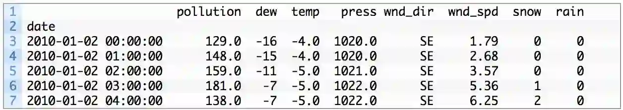 此数据包括日期、PM2.5 浓度,以及天气信息,包括露点、温度、气压、风向、风速和降水时长。原始数据中的完整特征列表如下: