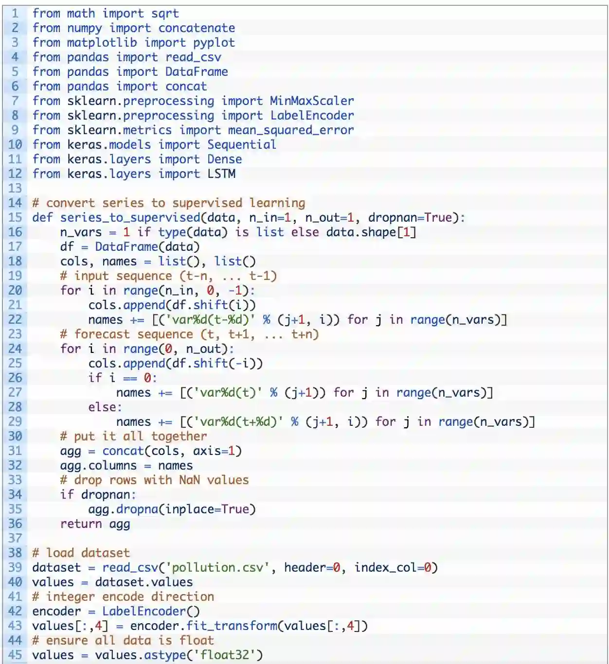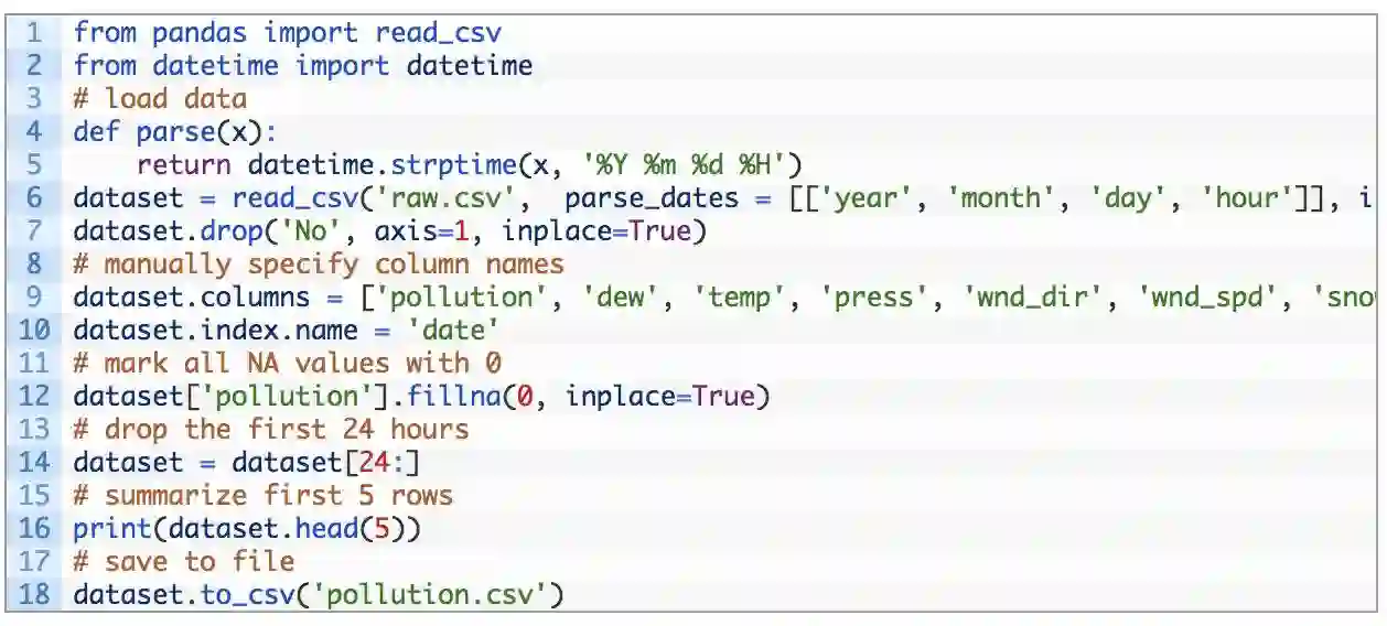 第一步是为 LSTM 模型准备污染数据集,这涉及将数据集用作监督学习问题以及输入变量归一化。